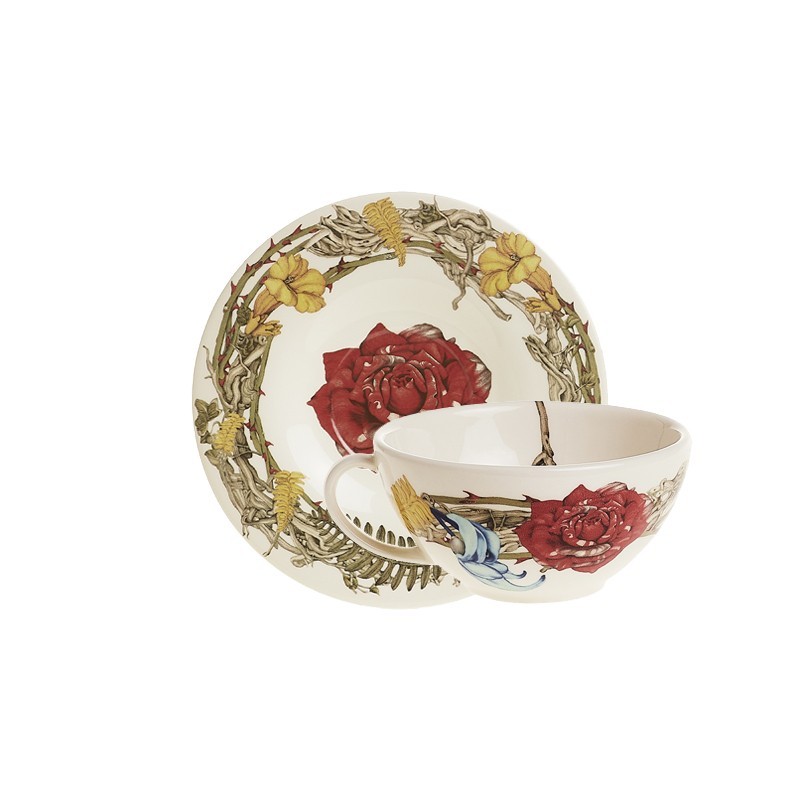 Set de taza desayuno con platillo Geórgica ilustrada por Carmen García Huerta. Pieza fabricada a mano con loza fina en España.